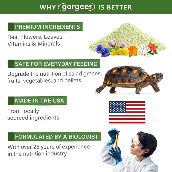 - MADE IN THE USA using the finest ingredients and highest manufacturing standards, developed by our experienced herpetologist with over 25 years of experience. If you are not happy, we are not happy - don't hesitate to send us a message! We'll do our best to ensure your satisfaction with Gargeer.